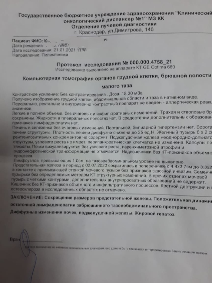 В конце концов все же КТ сделали. Результат ниже, но если в двух словах, то налицо явное улучшение. Болезнь отступает.