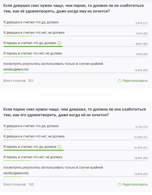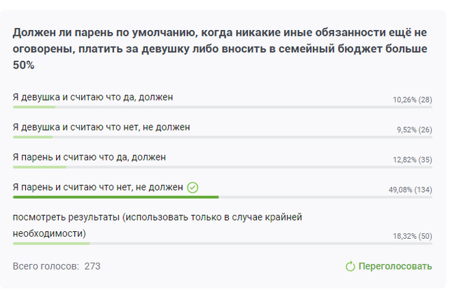 Работаем мы вместе уже несколько лет и за это время я видел как разрушились две семьи. Один такой "мужик настоящий" с одним членом в руке остался, хотя был накормлен, одет, обут и всегда на работу приносил пирожки от жены на всех и кушал далеко не одну гречку с макаронами из контейнера. И второй тоже такой же "настоящий мужик, который должен изменять" постоянно ходил и просил удалить переписки, чтобы не спалиться нигде - спалился - и теперь поливает бывшую жену дерьмом, что та посмела подать на развод и на алименты.