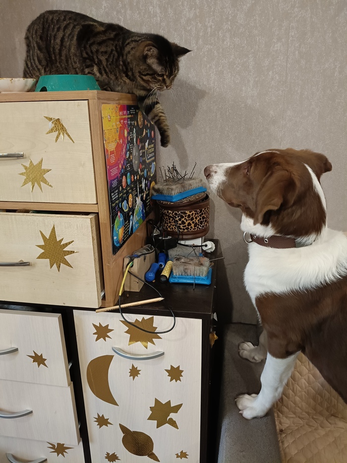 С котиками пока всё сложно. Не дружат. Но, как мне опять же сказали кинологии, надо отпустить ситуацию. Главное никто никого сожрать не хочет. Коты в принципе её не боятся, но и близко не подпускают, включают шипелки и махалки. А Бусе так хочется поиграть, даже игрушки им носила - не принимают в свою банду.