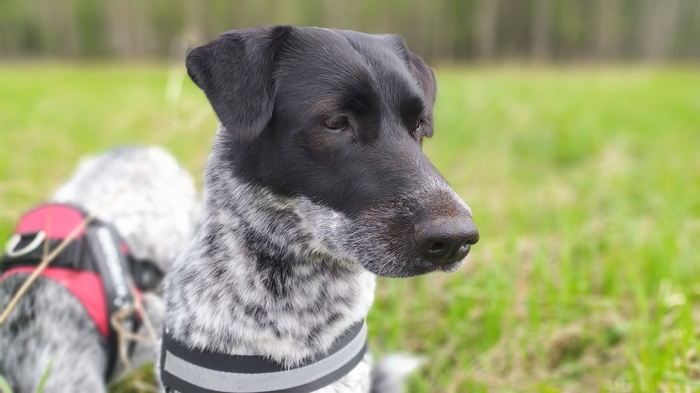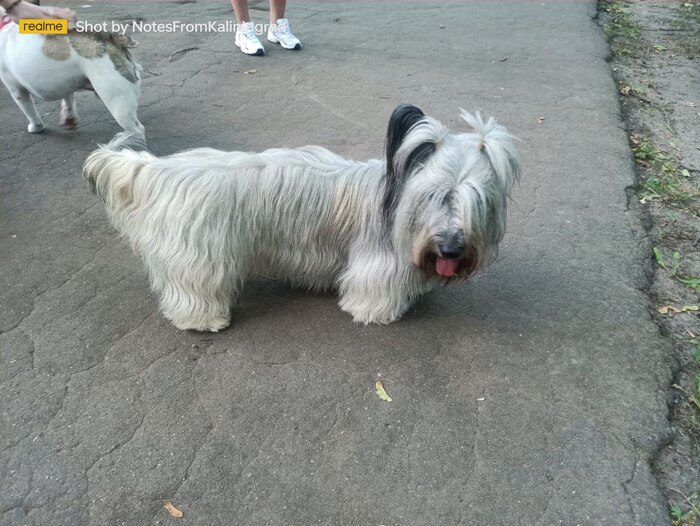 Оказался пугливым: пока мы общались с хозяйкой, из дальнего конца парка раздался хлопок как от салюта, что спугнуло нашего сегодняшнего героя. Хозяйке пришлось бежать и ловить своего питомца.
