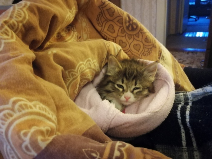 Этим же вечером моя супруга, убитая горем, увидела пост - в подвале дома соседнего микрорайона обнаружили выводок, кошку с двумя котятами... Одного котенка - девочку с больными, гноящимися глазками, но, в целом, здоровую, удалось поймать.
