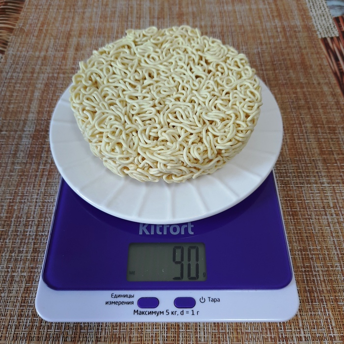 Пока закипает вода начинаем осмотр. Лапша пшеничная. Плоская и широкая. Длинная и бледная. Масса 103 грамма.