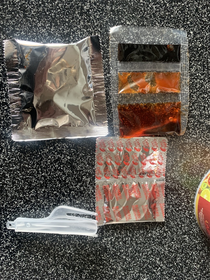 Вскрываем упаковку и находим внутри пакет с рисовой лапшой, суповую основу и масло.