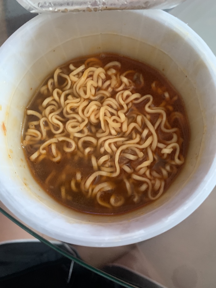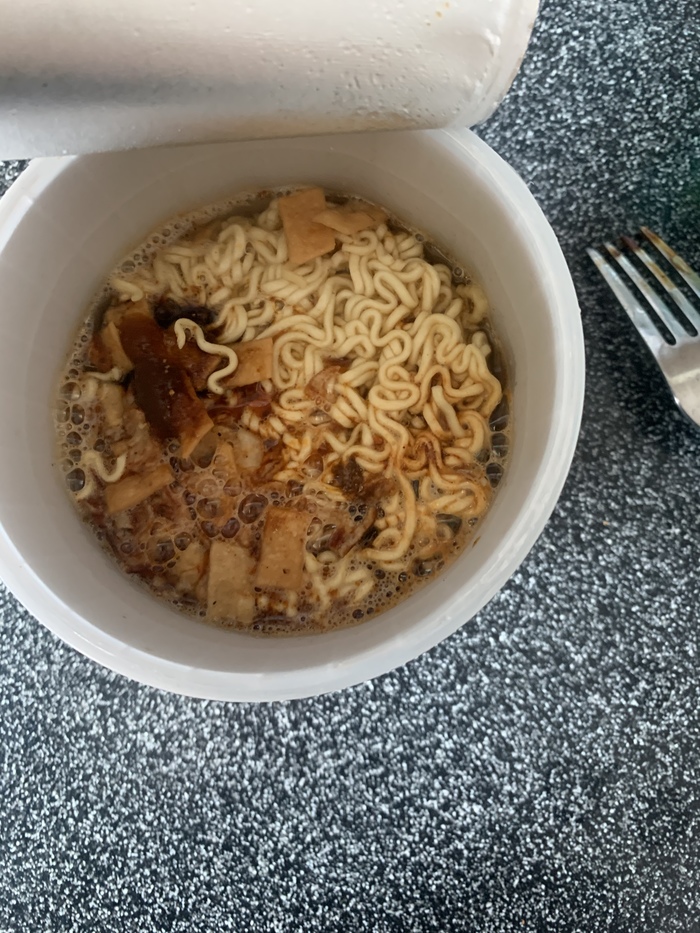 По инструкции выкладываем лапшу и специи в глубокую тару. Заливаем 400 мл. кипятка. Накрываем крышкой и ждем 3 минуты. После перемешиваем и смотрим что получилось.