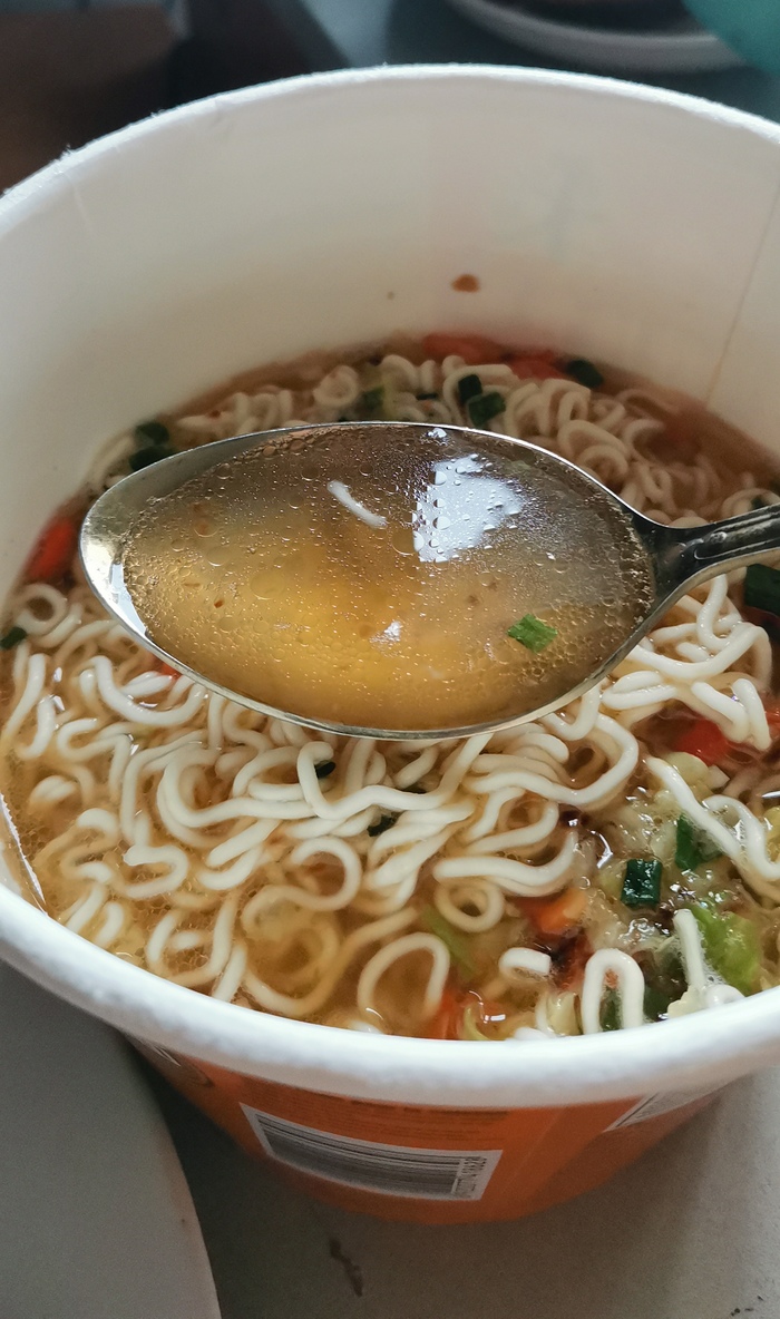 Несмотря на то, что масса сухой лапши всего около 50 грамм, порция получилась немаленькая. Пробуем бульон, а он никакущий. Вот совсем нулевой. При этом пахнет приятно, немного мясом, немного специями, но на вкус чуть соленая водичка без какого-либо вкуса, аромата и остроты. Лапша несколько скрашивает впечатление. Она имеет хорошую текстуру, не размякла, приятно жуется. Но вкуса опять-таки никакого. Более того после употребления всей порции почувствовал неприятное послевкусие. В общем лапшичка на слабенькую троечку с минусом. Если употреблять одну лапшу без бульона и сдобрить ее каким-нибудь соусом, да добавить топингов, то сойдет. А в базовой комплектации удовольствие ниже среднего. Съел и забыл. Спасибо за внимание! До новых встреч! Любите лапшу! Chúc ngon miệng!