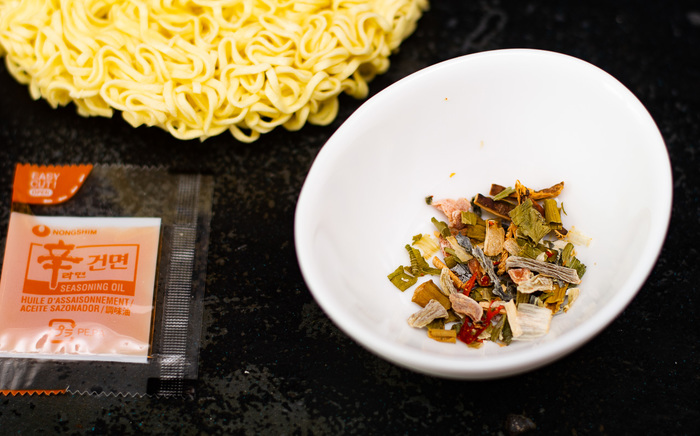В упаковке у нас брикет лапши действительно слегка более светлый чем обычно, и три пакетика. В обычном Shin Ramyon их кстати два. В дополнительном пакетике у нас пряное масло. Ну никуда от него не деться, да?