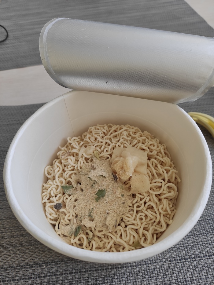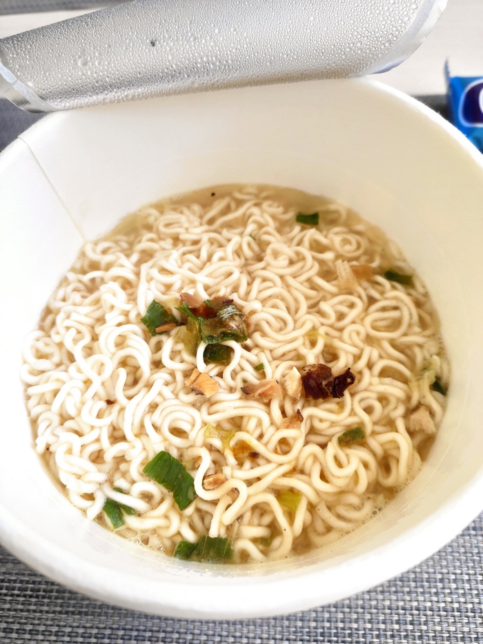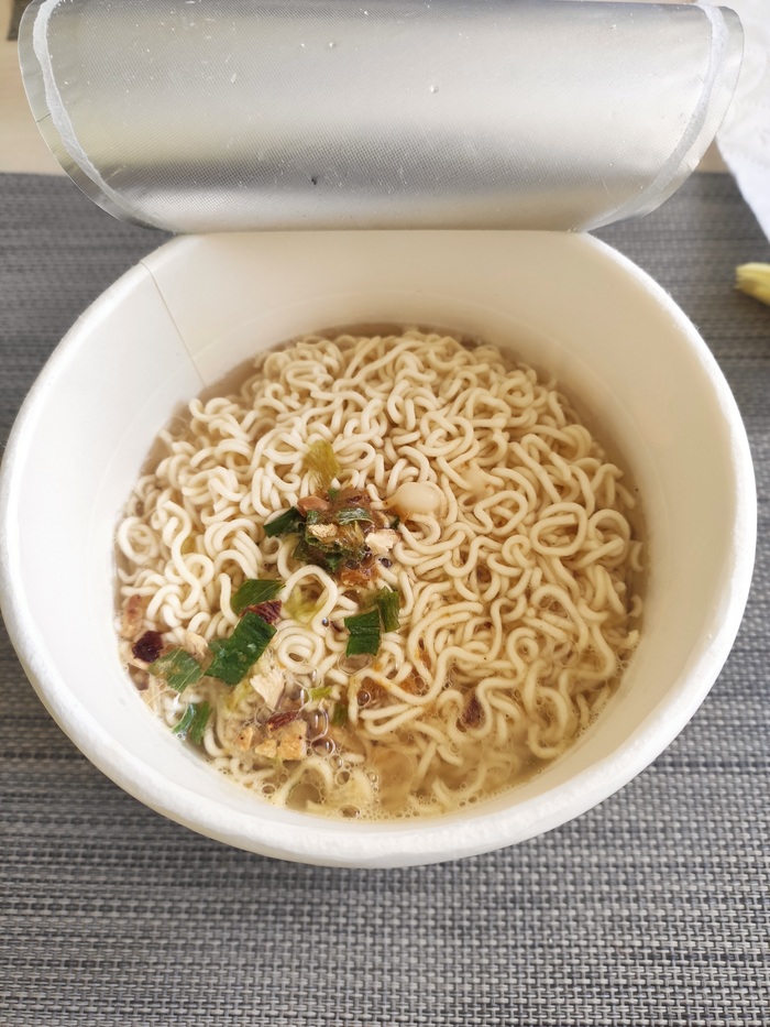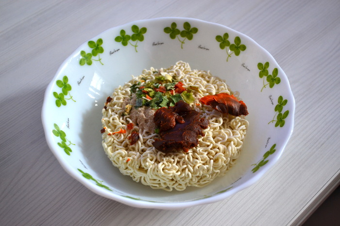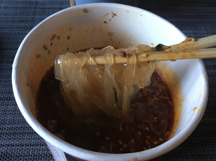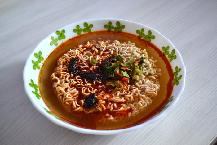 Но с соусом нужно быть осторожнее: он не впитывается в лапшу и не растворяется в бульоне, а как бы оседает сверху. Поэтому, если не расчистить себе в жидкости лунку и выпить весь соус с бульоном, на лапшу его огненной остроты не хватит. К слову, лапша тонкая, гибкая и в меру упругая, к тому же, в данной композиции служит лишь фоном для вкуса.