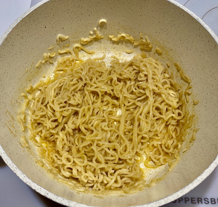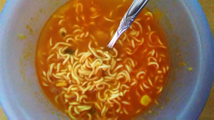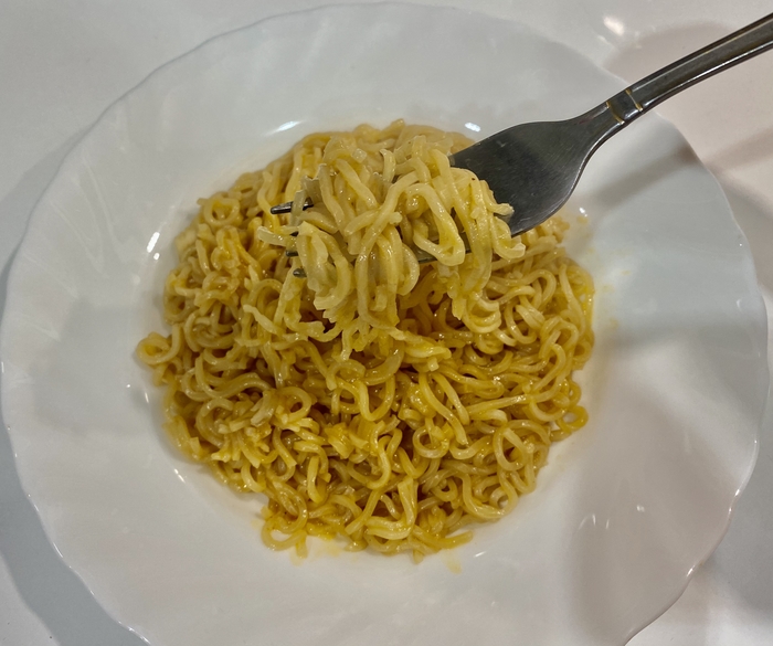На фото этого не видно, но лапша осталась немного влажной, даже можно сказать склизкой. Ещё когда готовил почувствовал очень назойливый запах приправы, больше всего он напомнил мне сухарики "Кириешки" со вкусом бекон. Вот прям всё равно что сунуть нос в только что открытый пакетик. Сомнительное удовольствие. Консистенция лапши тоже не порадовала, уж очень она размокла, хотя делал всё по инструкции, а воду отменял мерным стаканом.