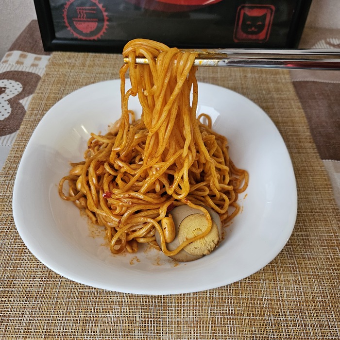 Во-первых это красиво! Размер порции вполне приличный. Запах бомбический. Тут тебе и китайские пряности, и мясной дух, и что-то ещё неуловимое, но аппетитное. Эта лапша получилось более маслянистой не сухой, как прошлая от этого производителя. Сама лапша выше всяких похвал! Очень вкусная, приятной текстуры, идеальной толщины. В совокупности с соусом совсем хорошо. Он кисло-сладкий, в меру пряный. Но не в меру острый. Вот тут ребята постарались. Острота никак не меньше, чем в buldak x2. При чём острота именно за счёт красного перца. Его вкус также весьма хорошо ощутим. Яйцо приличное, плотное, чуть суховатое. Арахис шикарен! Хорошо поджарен, хрустящ.