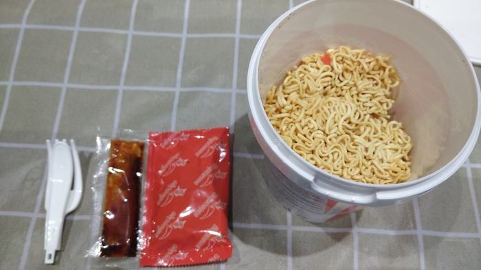 Рассмотрим содержимое. Сама упаковка состоит из двух частей. В одну выкладывается нагревательный элемент, во вторую лапша с добавками. Крышка с отверстием для выхода пара.