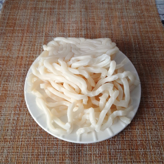 Вскрыв пакет, обнаруживаем толстую белую картофельную лапшу. Внешним видом напоминает сыр-спагетти.