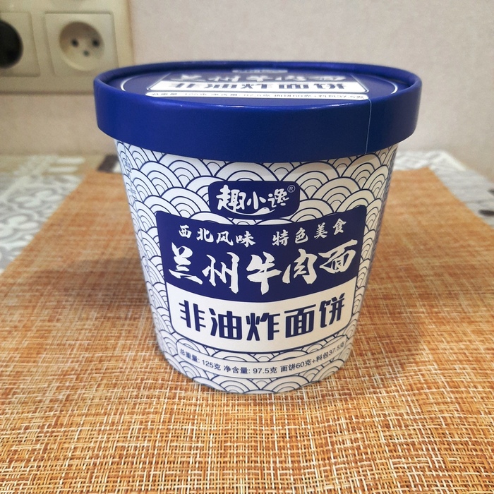 Всем привет! Хочу украсть у вас пять минут вашего драгоценного времени и рассказать о своём очередном исследовании в области продукции быстрого приготовления. Сегодня пробую Ланьчжоускую лапшу с говядиной. Как уже понятно по названию лапша произведена в Китае, а приобретена, как водится, на Wildberries. Стоимость её на момент приобретения составила 141 рубль. Подопытный представляет собой небольшой картонный стакан с картонной же крышечкой. Никакого особо интересного оформления не несёт. Сине-белый узор. Да в одном месте нарисован замок под флагом. Информация на упаковке вся на китайском языке.
