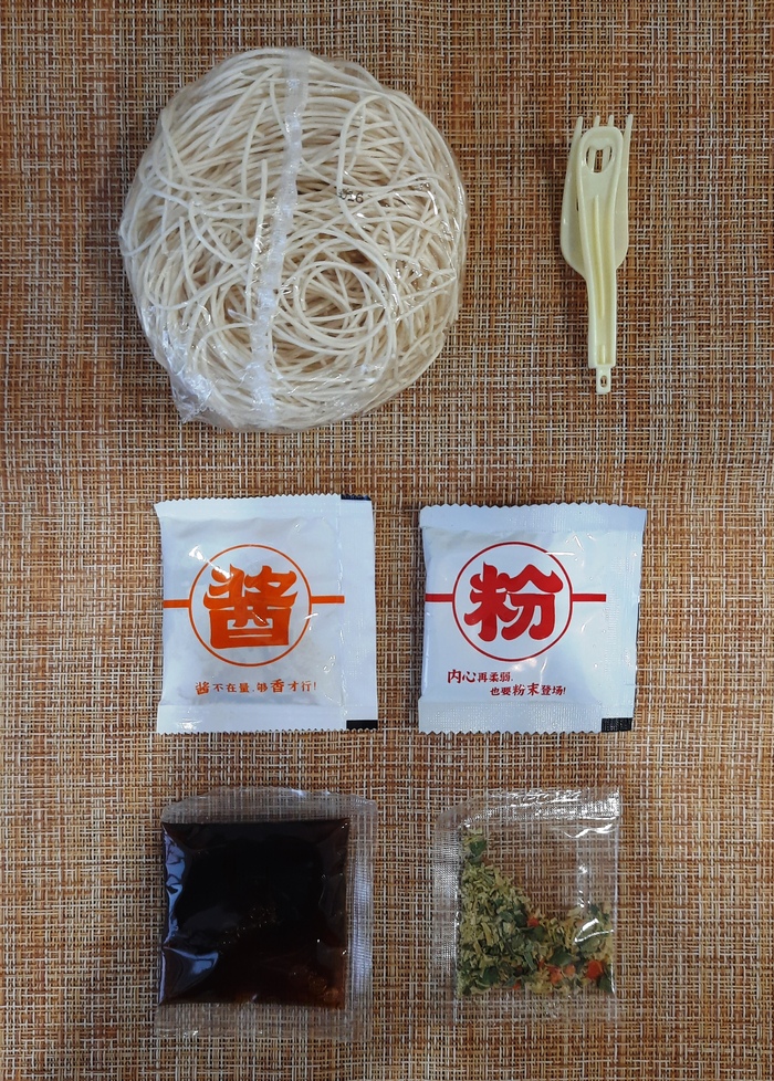 Внутри пачки находим: вполне стандартный на вид брикет лапши (приглядитесь, обычный же) пакетик с сухими овощами и мяском, пакетик с жидким соусом и ещё один с порошковой приправой.