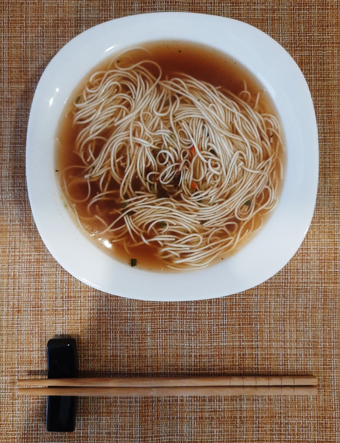 Лапшундель прекрасна. Она не просто упругая. Она пружинит, но поддатливо расплывается во рту. Бульон в меру ароматный, с чуть выраженной кислинкой, но, острый. Обычно выложкиваю его первым, а потом подбираю лапшу. Здесь не фартануло, пришлось перемежать, чтобы чуть сгладить перцевость. Но попускает довольно быстро, на языке ещё чуть печёт, а в животе уже тепло. Прекрасное блюдо для осенней холодрыги, рекомендую.