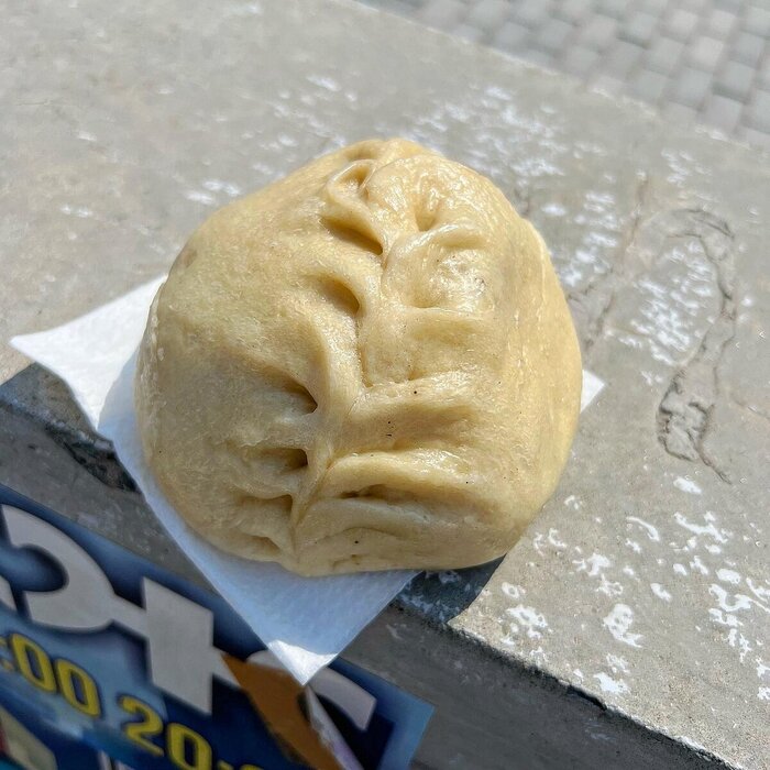Пористое паровое тесто. Начинки много. Удалось идентифицировать мясо, капусту, лук и чёрный перец а-ля «Приправыч» из пакетика. Запашок есть, но очень умеренный.