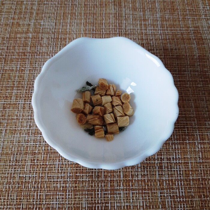 Юба в виде маленьких рулончиков. С примесью неопознанной зелени. Немного, но когда заварится и развернётся станет больше.