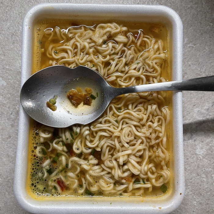 4) лапша...это фиаско. Она никакая. Ну вот совсем. Нет, она заварилась хорошо, не в сопли. Но вкуса ноль, бульоном не пропиталась, дико много крахмала и жевалась не сильно приятно. Как будто кусок резины жуешь без вкуса.