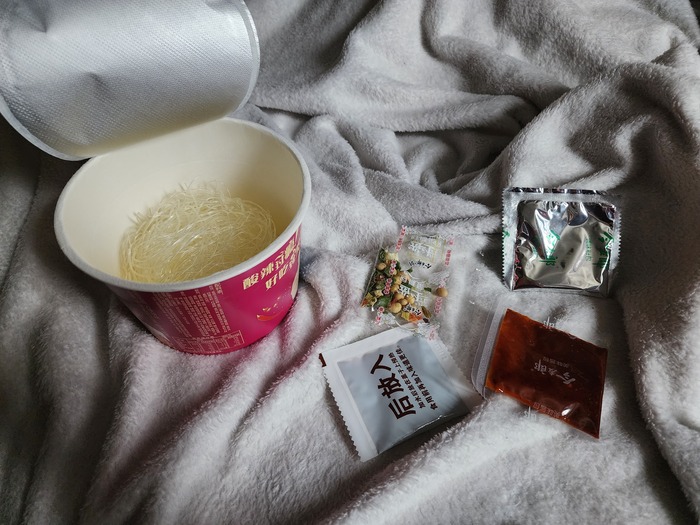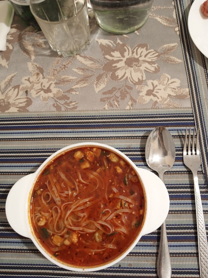Порция достаточно большая. Лапши много, бульона не очень. С него и начнём. Как видим бульон мутный, густой. Сначала чувствуется мясной вкус, затем идёт кислинка от соуса и небольшая острота в районе 1,5-2 островатт. Отдалённо напоминает щи, но с азиатским уклоном. Тот сычуаньский перец, который был в аромате приправы куда-то делся. Во вкусе бульона он совершенно не ощущается. Лапша тонкая и мягкая. Хорошо напиталась бульоном и ощущается весьма гармонично. Остальные добавки, за исключением юбы, не вносят какого-то разнообразия во вкус и не заслуживают внимания.