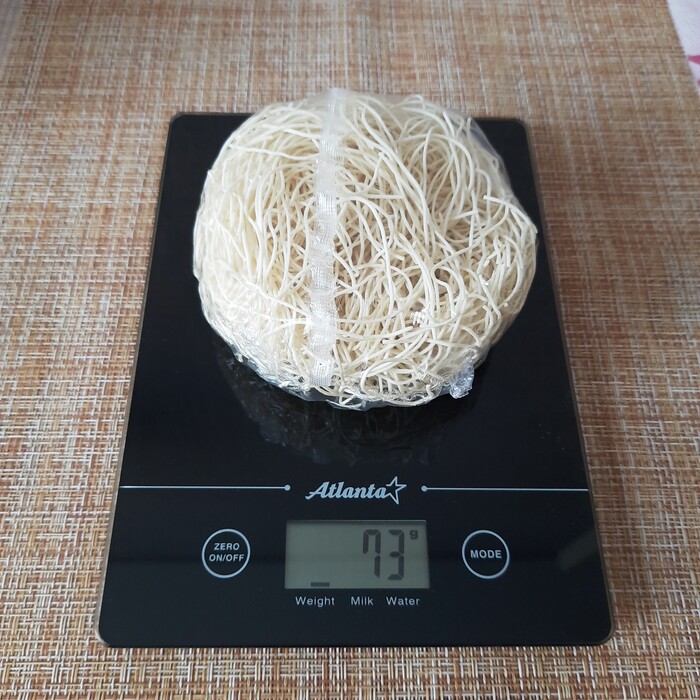 Кстати, из-за ее скользкости и длины, а так же тонкости - рекомендую употреблять ее палочками. Для вилки - слишком много лапши в начале и слишком мало в конце.