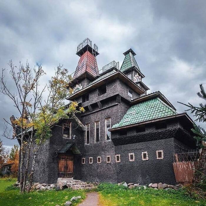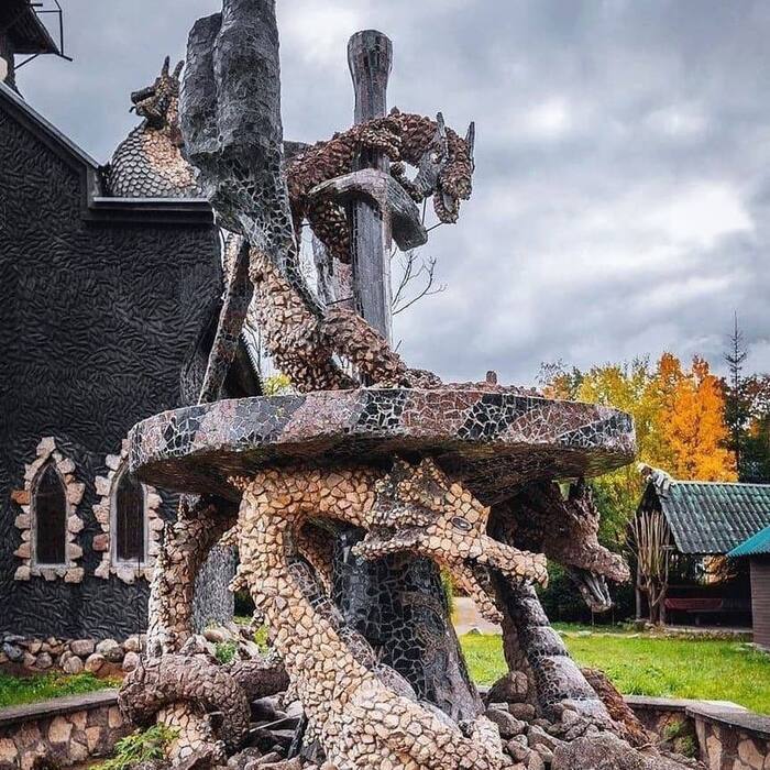 В его архитектуре словно соединились готика, средневековые легенды и немного русских народных сказок. На крыше дома сидят драконы. Фонтан так же украшен драконами.