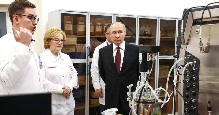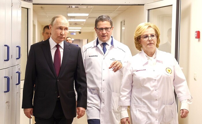 На фото Владимир Путин с руководителем Федерального медико-биологического агентства Вероникой Скворцовой и директором Федерального центра мозга и нейротехнологий ФМБА Всеволодом Белоусовым. Фото: Александр Рюмин.