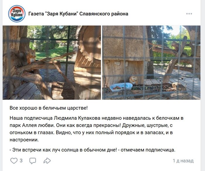 Белок помещают в вольеры, которые условно можно назвать «передвижными зоопарками». Фото прилагается. Увы, для животных нахождение в этих «условных зоопарках» не просто вредно, но мучительно и смертельно опасно. Жаль, что хороший импульс- заботы о природе был превращен в свою полную противоположность