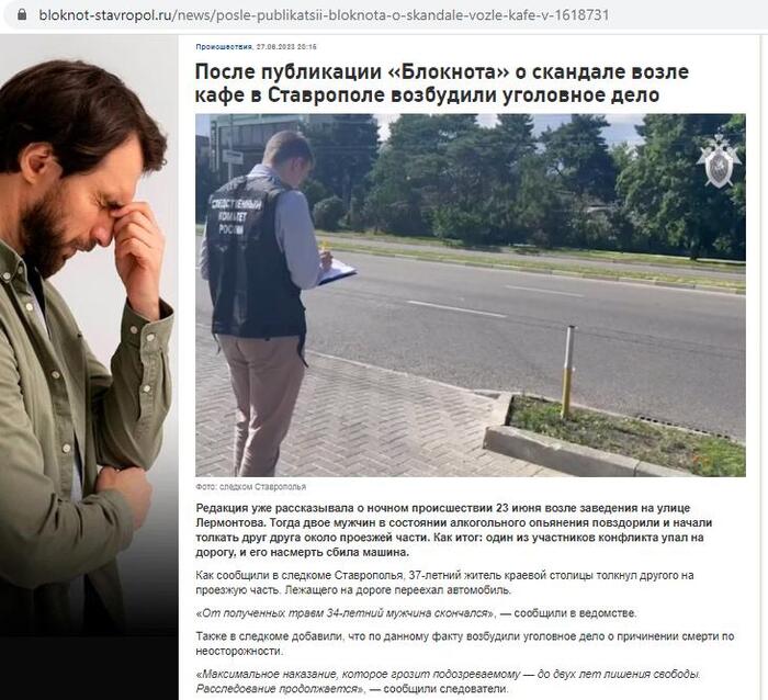 Позднее, 26.06.2023 возбуждается уголовное дело по ст. 109 УК РФ (Причинение смерти по неосторожности) "После публикации «Блокнота» о скандале возле кафе в Ставрополе возбудили уголовное дело"