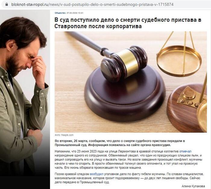 Если провести параллель, то видно, что дело поступило в суд 21.03.2024, на новостном портале "Блокнот Ставрополь" новость по поступлении дела в суд опубликована 27.03.2024, в публикациях указано, что конфликт возник между судебными приставами.