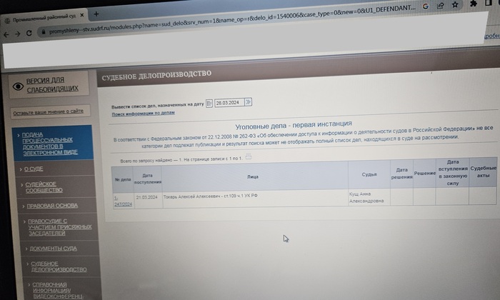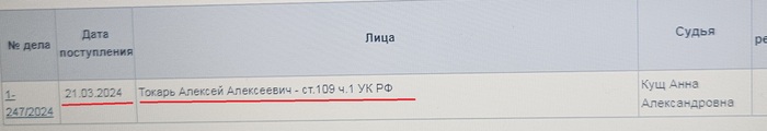 Подтверждение на скриншотах, а также на сайте Промышленного районного суда г. Ставрополя, в разделе "Судебное делопроизводство" (https://promyshleny--stv.sudrf.ru/). В дневное время сайт суда работает с задержами. Поэтому скриншоты возбужденного уголовного дела в отношении Токарь Алексея Алексеевича, по ст.109 УК РФ прилагаются.
