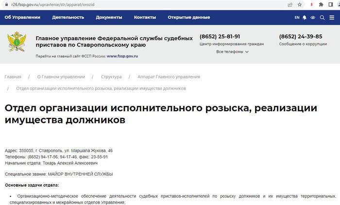 На всякий случай прилагаю скриншот с официального сайта приставов Ставропольского края, где указана должность и звание Токарь А.А. (майор внутренней службы).