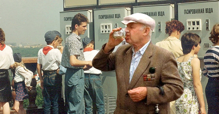 На улицах стояли автоматы с газированной водой, которая была самая вкусная на свете. Тогда люди более бережно относились к вещам и природе. Это сейчас всё разливается в одноразовые пластиковые стаканы, а тогда были обычные стеклянные. Их иногда брали местные алкоголики, чтобы было из чего выпить. Но, надо отдать им должное, всегда возвращали!