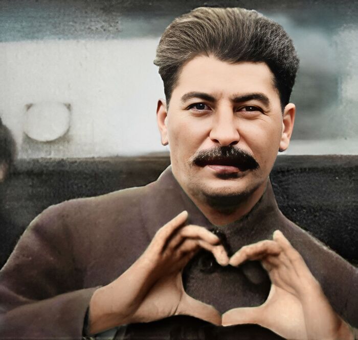 Показал её другу, большому поклоннику Сталина, и он загорелся сделать себе принтов с ней: футболки, кружки, и т.д. Но, в таком качестве она мало для этого годилась, а лучшего не нашлось. Взялся её почистить, окрасить, увеличить. Вышло так: