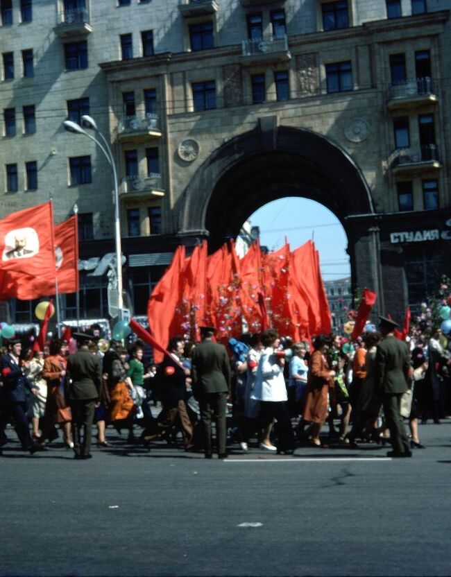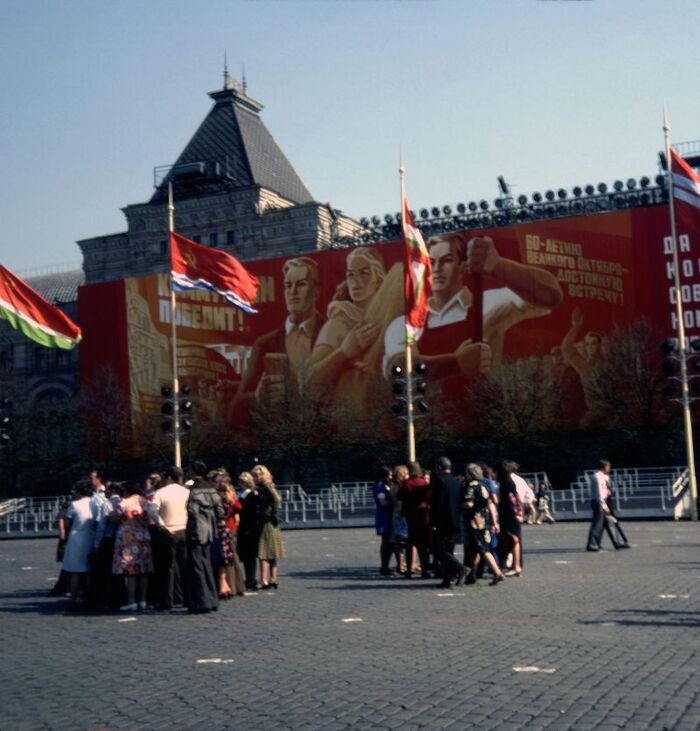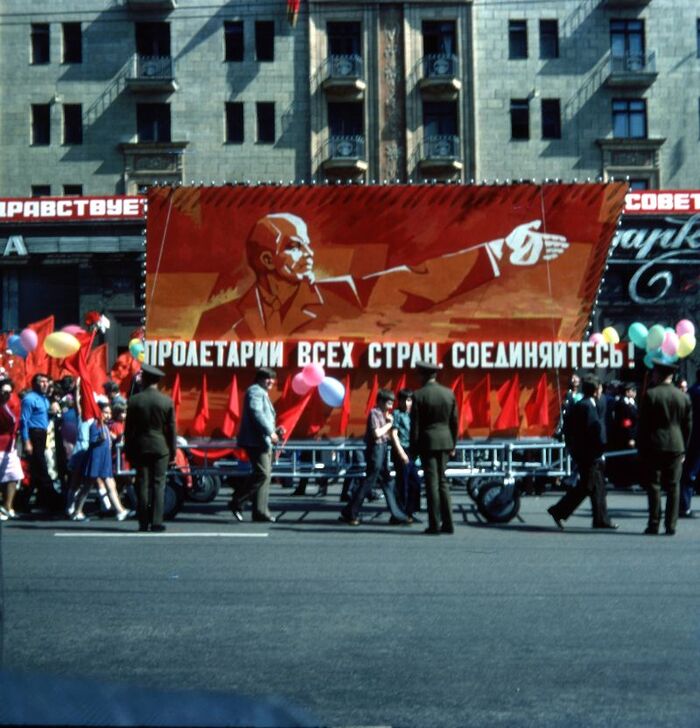 Красный фон символизирует революционный дух и борьбу за свободу и справедливость. Это цвет социализма и коммунизма, который напоминает о великих победах трудящихся и борьбе за права рабочего класса.
