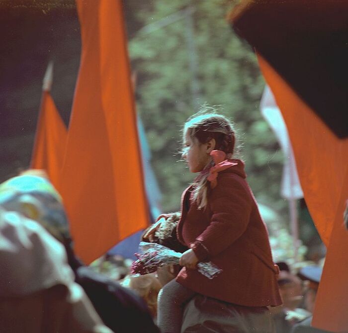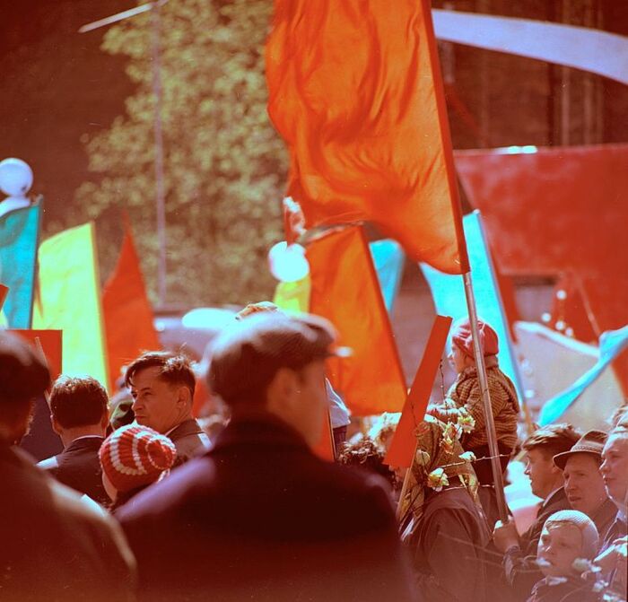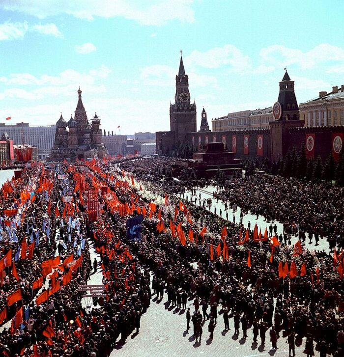 Красный фон символизирует революционный дух и борьбу за свободу и справедливость. Это цвет социализма и коммунизма, который напоминает о великих победах трудящихся и борьбе за права рабочего класса.