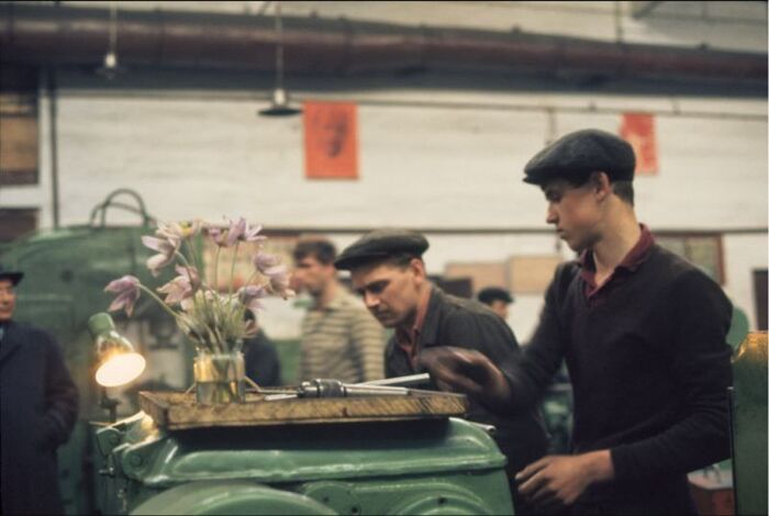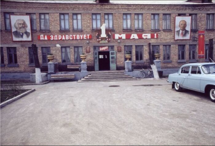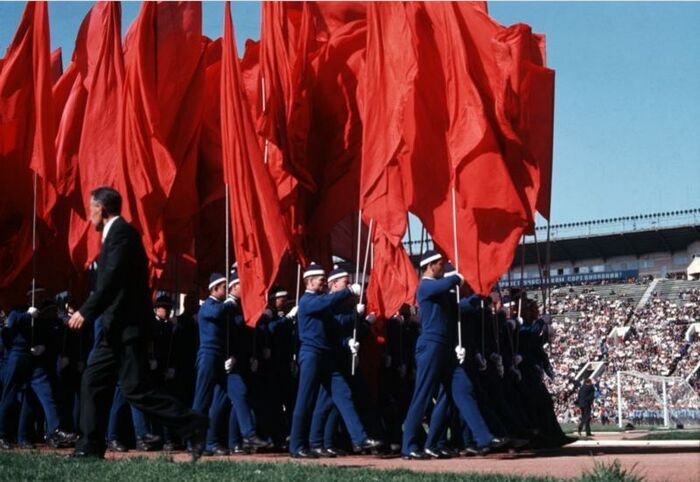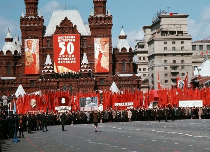 Красный фон символизирует революционный дух и борьбу за свободу и справедливость. Это цвет социализма и коммунизма, который напоминает о великих победах трудящихся и борьбе за права рабочего класса.