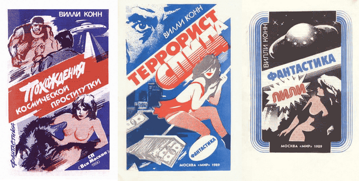 Что же с отечественными произведениями? В 1990-х на рынке появились книги, с лихвой компенсирующие недостачу секса в советской фантастике; носили они откровенно коммерческий характер. Выделяются творения Вилли Конна с говорящими названиями: «Похождения космической проститутки», «Сексуальный маньяк», «Хуанита умеет все». Сегодня такой лютый трэш способен разве что позабавить, но в свое время эти книги, издававшиеся немалыми тиражами, позволили заработать спрятавшемуся за иностранным псевдонимом бывшему члену Союза писателей СССР.