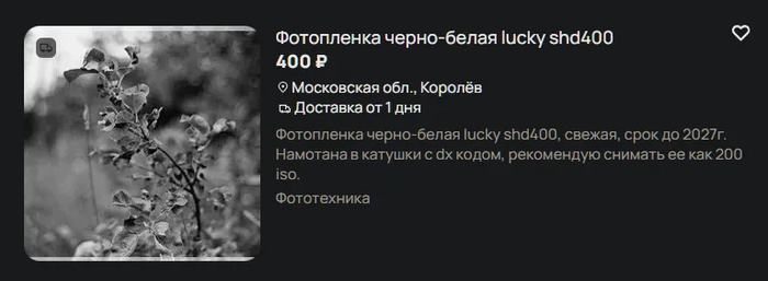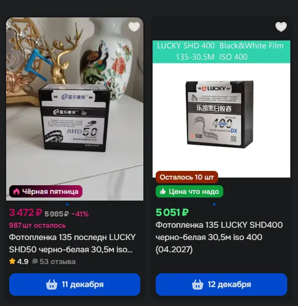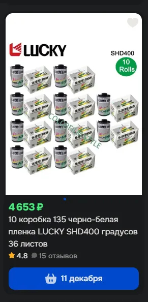 Аналогично с техничкой Lucky SHD. SHD50 (фактическая чувствительность 5 ед.) стоит ~3500 рублёв за 30,5 метров, SHD400 (фактическая чувствительность 200 ед.) - начинается от 5000 рублей.