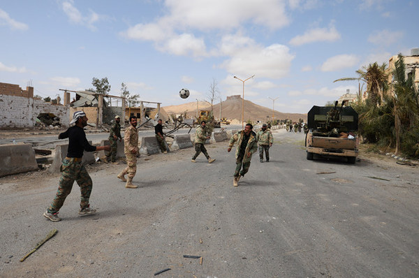2016 год, Пальмира. Бойцы сирийской армии и отряда народного ополчения «Соколы пустыни» на одной из улиц освобожденного города.