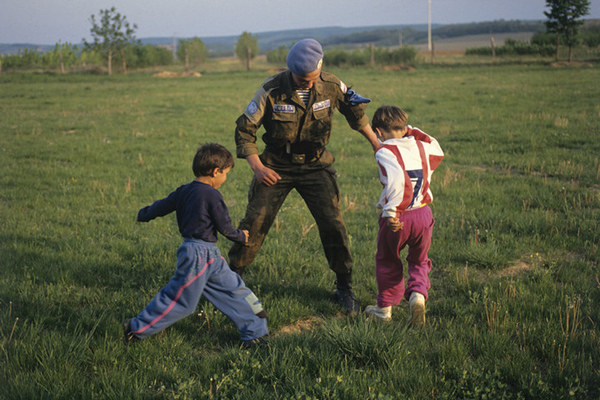 1992 год, Вуковар (Хорватия), Боснийская война. Боец российского воздушно-десантного батальона сил ООН по поддержанию мира в Югославии и местные пацаны.