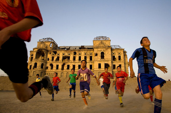 2007 год, Кабул. Афганские дети играют в футбол в полуразрушенном городе.
