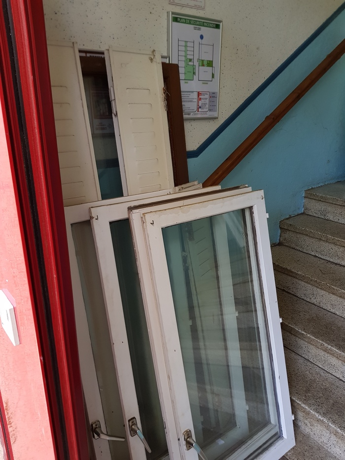 Новые окна ожидают своего часа у входа вместе со старыми ставнями.
