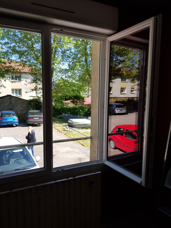 Все квартиры выходят на обе стороны здания окнами. Со стороны улицы окна пластиковые, с жалюзи, всё как надо. С другой деревянные, которые нельзя открыть в виде V, а только целиком створку. Ставни железные, складывающиеся. На фото выше видно, правда плохо.