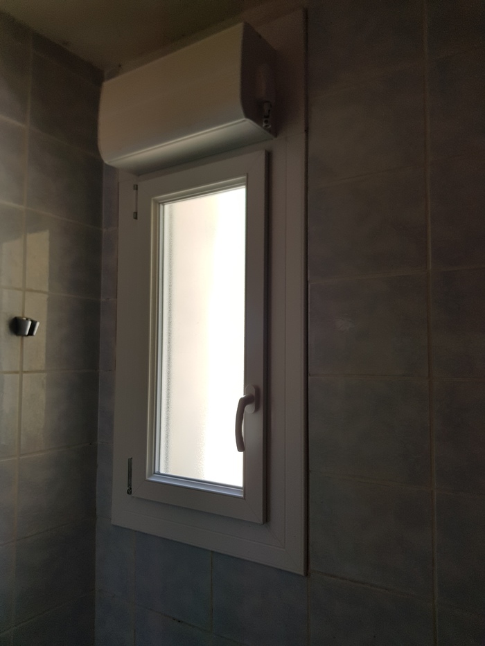 В ванной. Зато с жалюзи! Ручка от них ещё не прикручена.