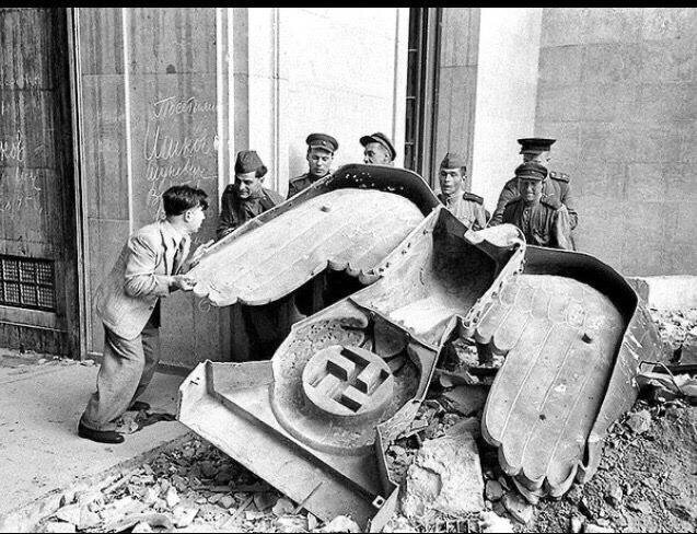 На фотографии огромный орёл со свастикой, висевший над входом в Рейхсканцелярию. После взятия Красной Армией, всё это скинули и разрушили.