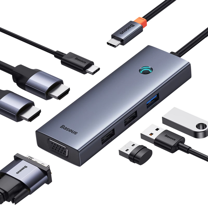 Как и следует из названия, Baseus UltraJoy представляет собой целую серию USB-хабов под различные задачи и любой бюджет. Baseus UltraJoy подключается к ноутбуку/планшету кабелем Type-C и позволяет получить в свое распоряжение порты HDMI, VGA, DisplayPort, кардридеры SD / Micro SD, дополнительные порты USB Type-A и Type-C, разъем mini Jack и даже Ethernet.