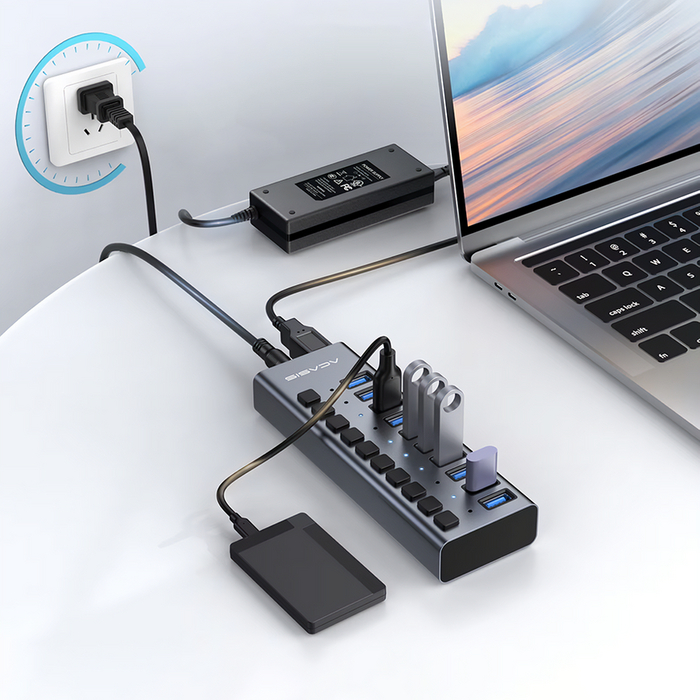 Следующий хаб изготавливается брендом Acasis в исполнениях на 7 / 10 / 13 / 16 портов USB Type-A 3.0 (пропускная способность до 5 Гбит/с).