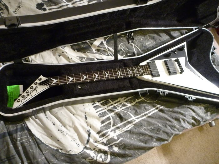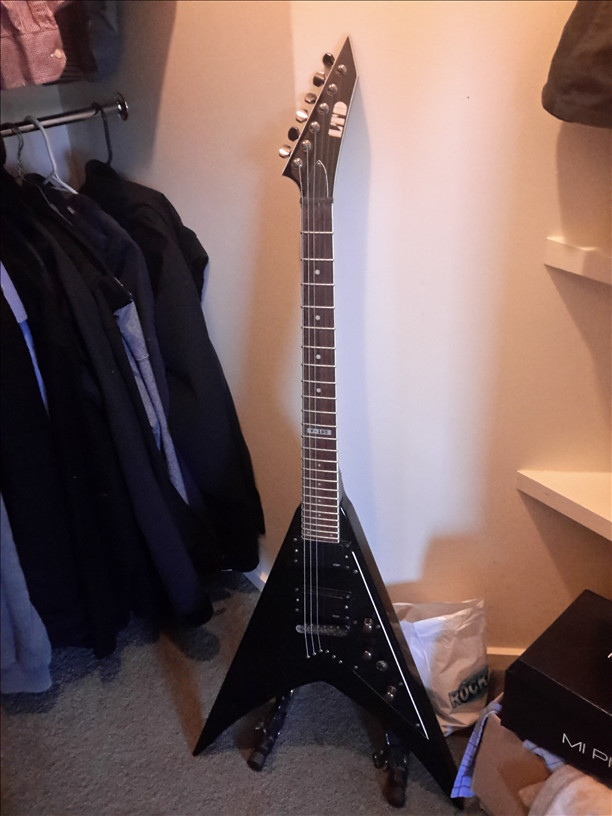 Мечта номер 2 моих 16-ти лет. "Стрела как у гитариста любимейшей группы Bullet For My Valentine". Хотя, по факту, у него подписная LTD MP600, но в то время я их не сильно отличал. И сравнив их сейчас, всё-равно больше склоняюсь к бюджетной Индонезийской V300 без локовых колков, но зато с пикгардом и стандартной инкрустацией точечками которая тут как раз в тему :в