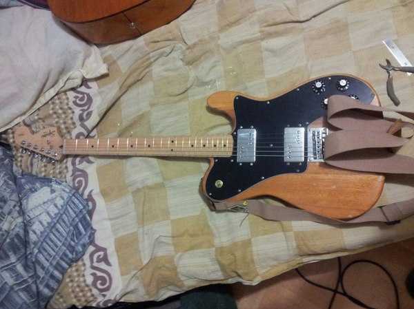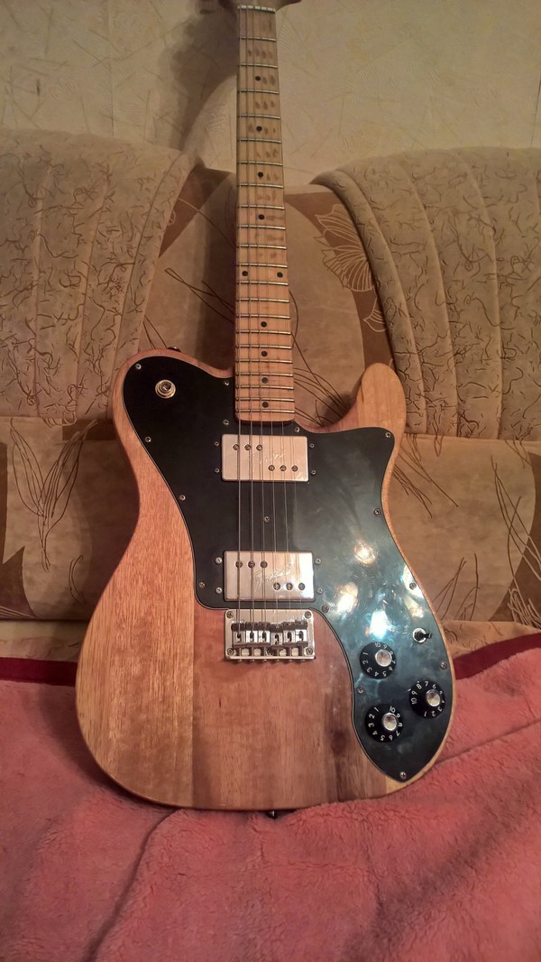 Дека обошлась в 2500 рублей. Пока я ждал новый полигон для моих шаловливых ручек, подумал над внешним видом. Из-за того, что бриджевая полость расточена под хамб, я решил эту деку переделать в Telecaster Deluxe 72.