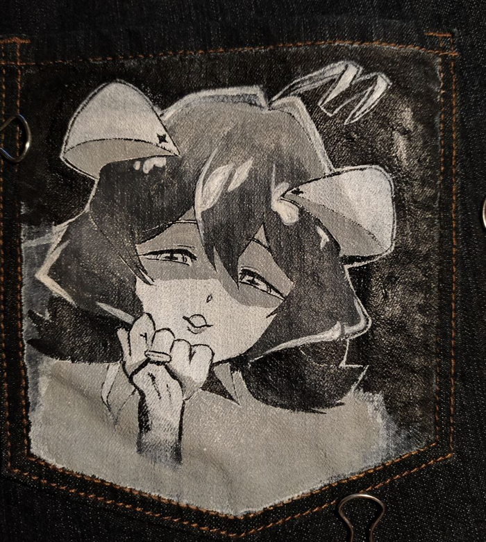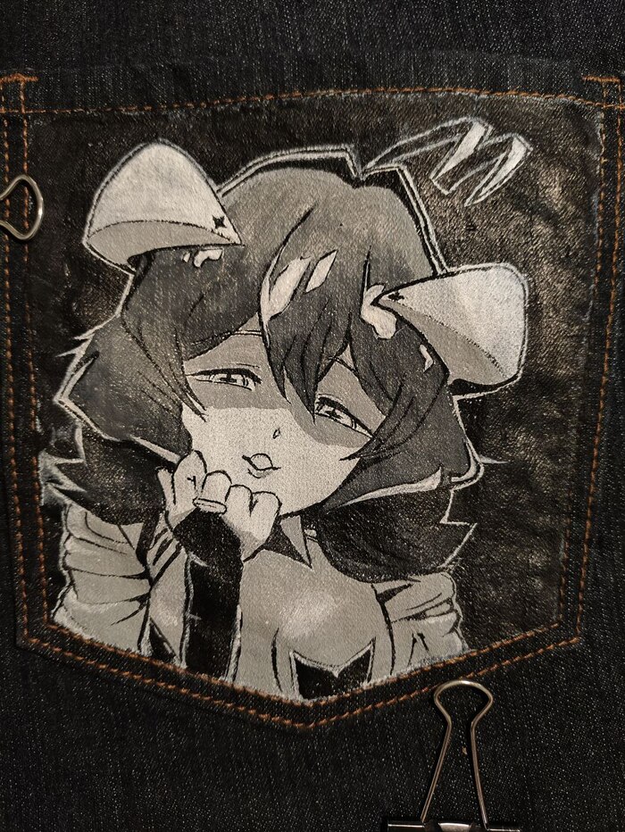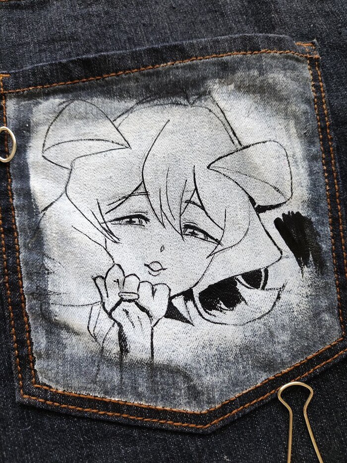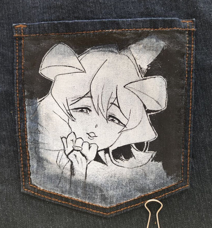 Для рисунка на штанине красок не хватило бы, поэтому выбор пал на задний карман. Решила ваять гг Безе/Бейсер из этти аниме сериала "Становясь волшебницей".