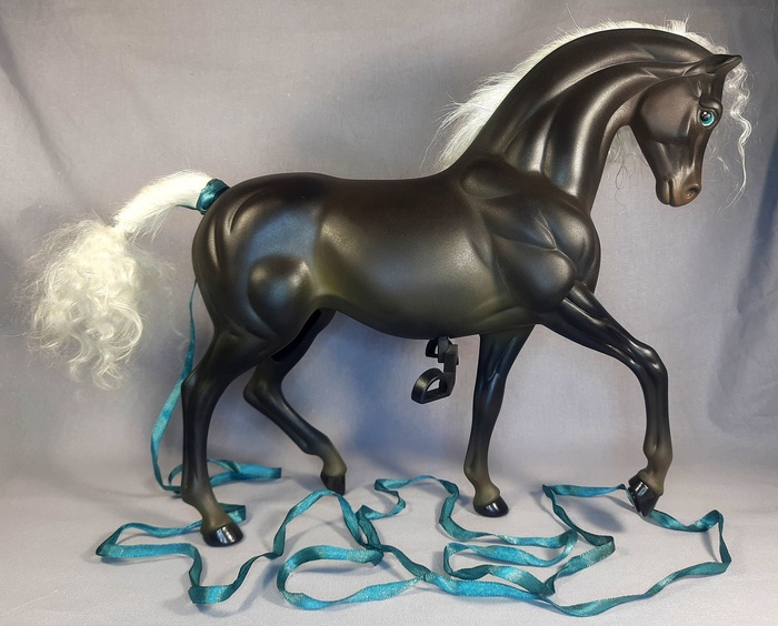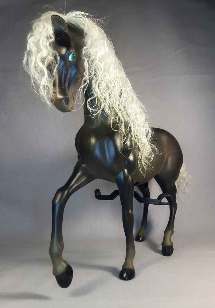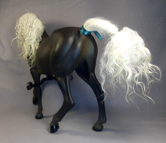 При кручении хвоста в стороны: стремена двигаются, имитируя раскачивание куклы, когда она верхом на лошади. Конь перекрашен, хвост модернизирован. Грива и хвост из натуральной козьей шерсти. Последнее фото - до преображения.